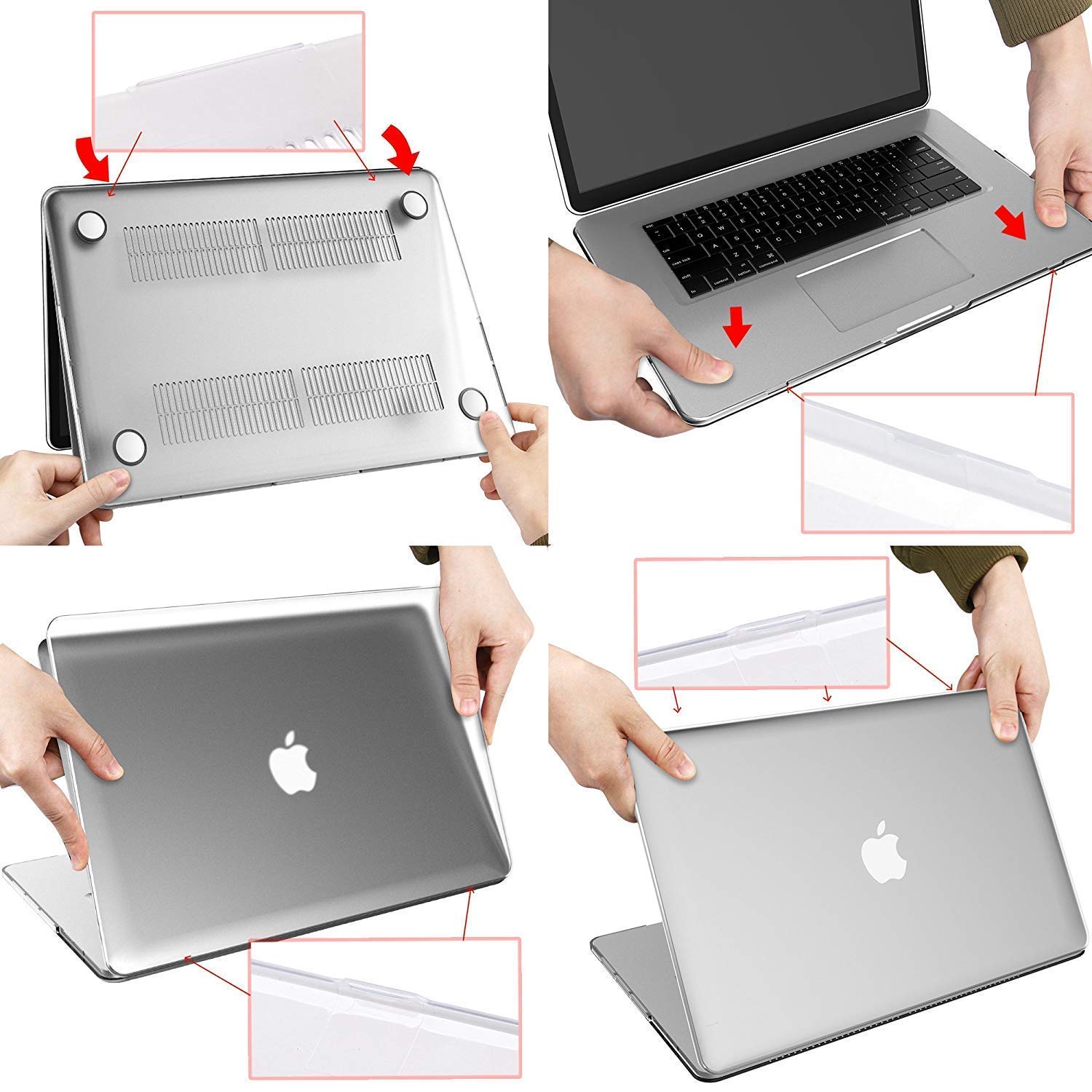 - [ CRYSTAL CLEAR HARDSHELL CASE ] -- Macbook air case Totally see-through crystal clear hardshell case, the macbook air 13 inch case cover laptop sign can be clearly seen, laptop back cover maximizes the original material of the MacBook and provides scratch protection for your 13" Mac Air. Snap-on design makes macbook cover easy to put on or take off.